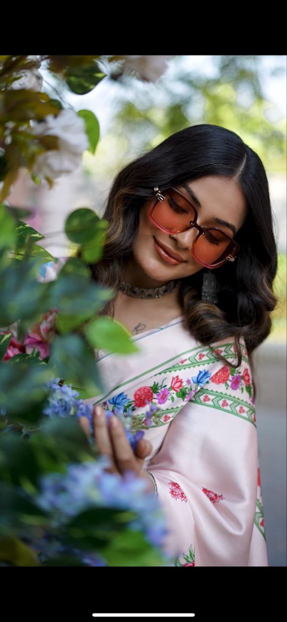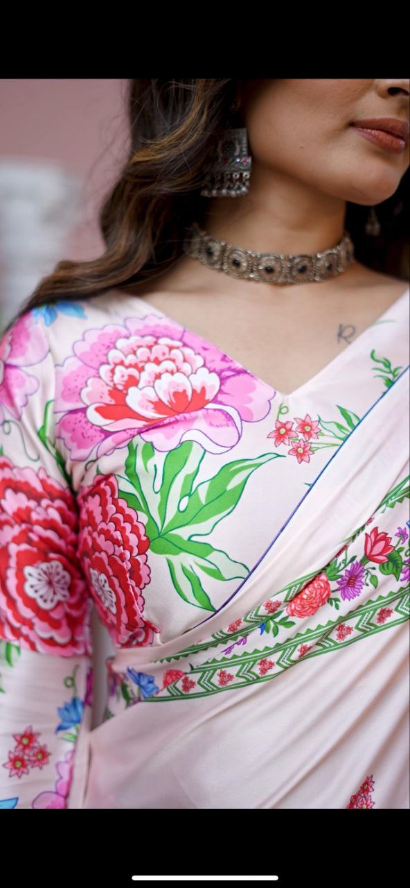 Light Pink Digital Floral Print Satin Saree Original Japan Satin (Devsena satin)